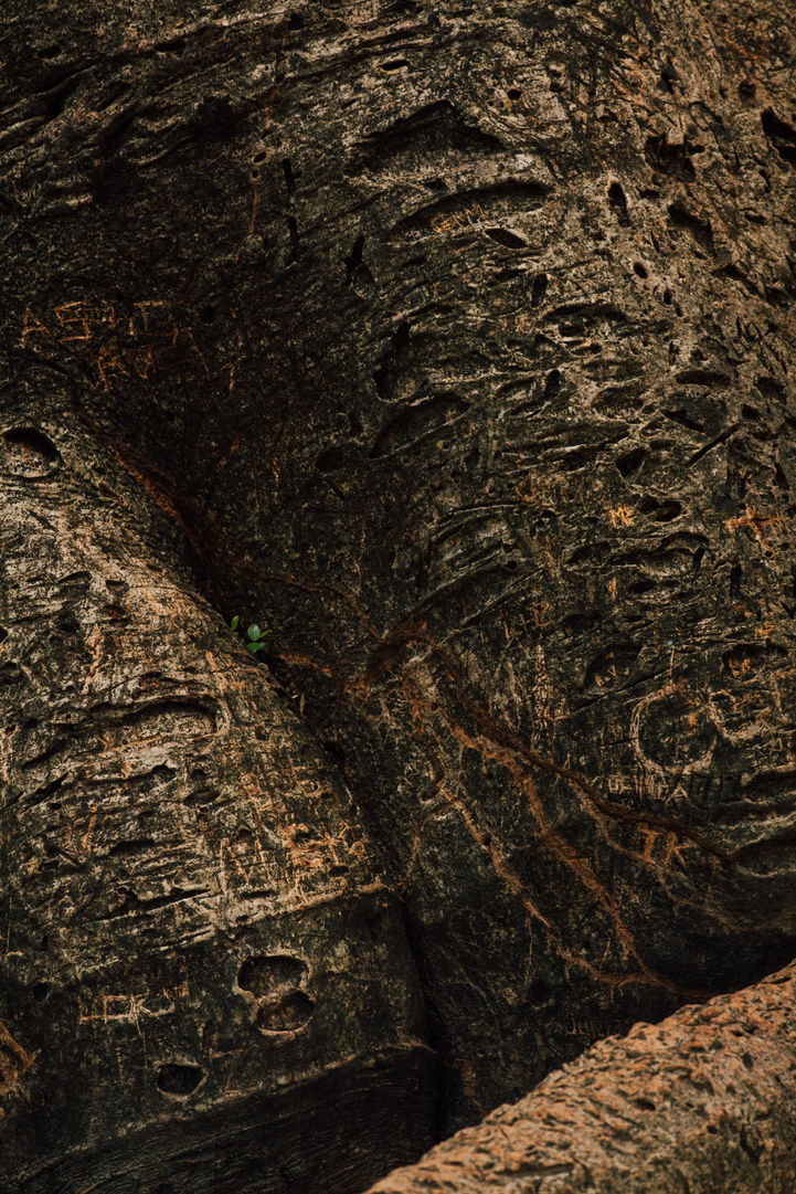 Os galhos são ramificações mais finas, que abrigam as folhas verdes, pequenas, alongadas e com pontas afiladas. O tronco pende em direção ao rio, está levemente na diagonal e repleto de marcas humanas, rabiscos, iniciais de nomes talhados no tronco que ferem a árvore ancestral. Há um prolongamento de uma raiz grossa, horizontalmente ao solo, quase como se abraçasse a terra.